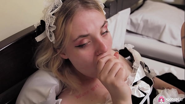 Horny blonde maid Angelina plays with a sex toy in a hotel room.